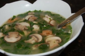 Сварете нарязаните гъби в подсолена вода. В маслото запържете нарязания лук и брашното. Добавете червения пипер и сложете малко вода. Изсипете сместа при гъбите, прибавете ситно нарязания спанак и оставете супата да се свари.